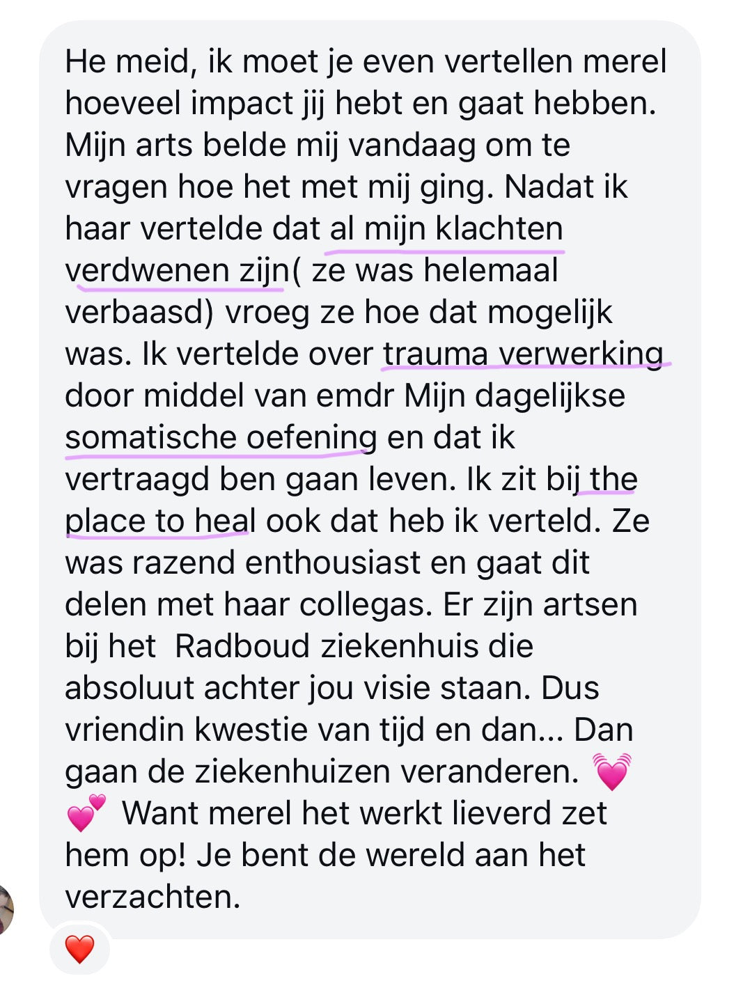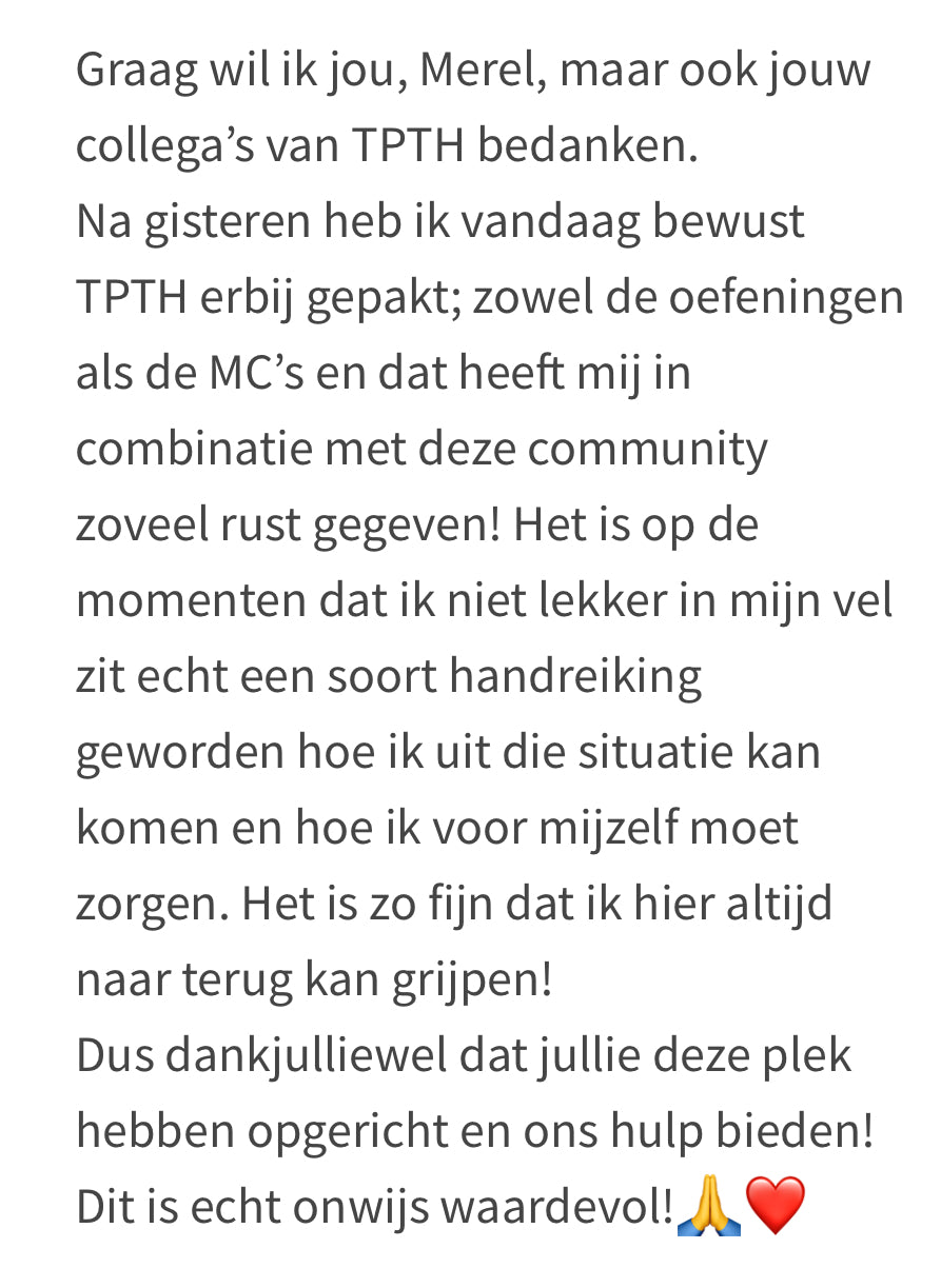 TPTH is niet zomaar een programma, het is een uniek & levensveranderende keuze wat al meer dan 500+ mensen in gemiddeld 3 maanden heeft geholpen hun klachten te helen en daarmee hun leven terug te krijgen (scroll verder voor de magische reviews 😍).