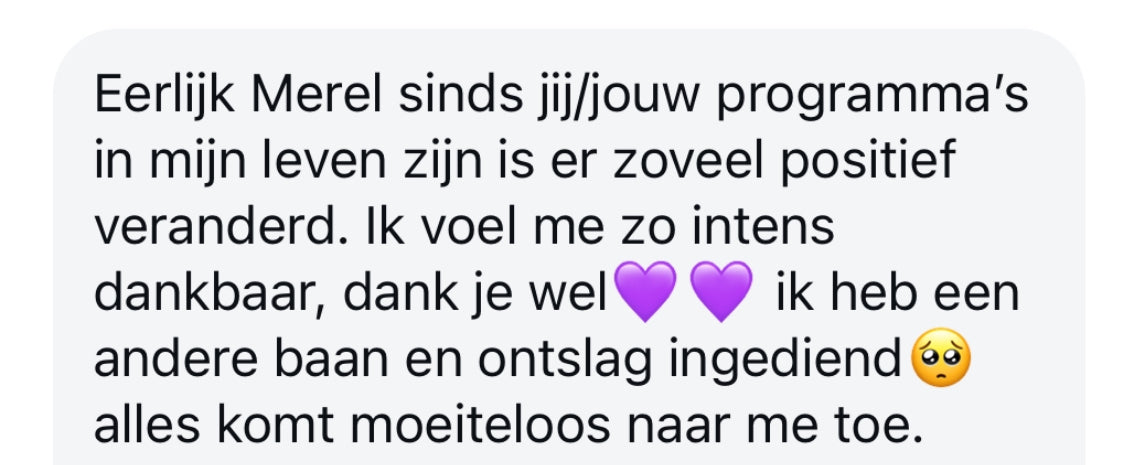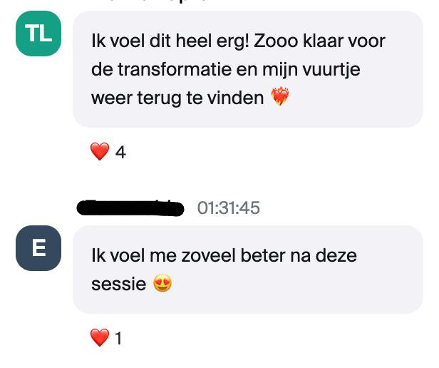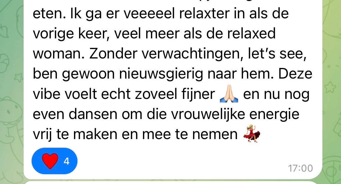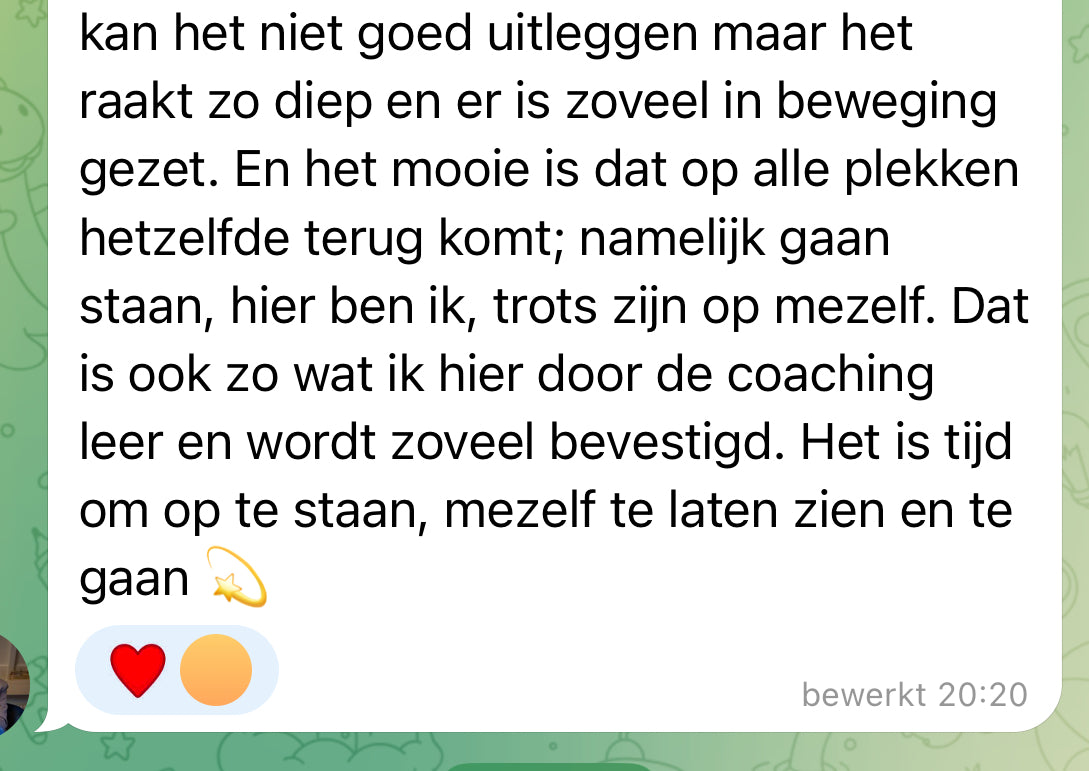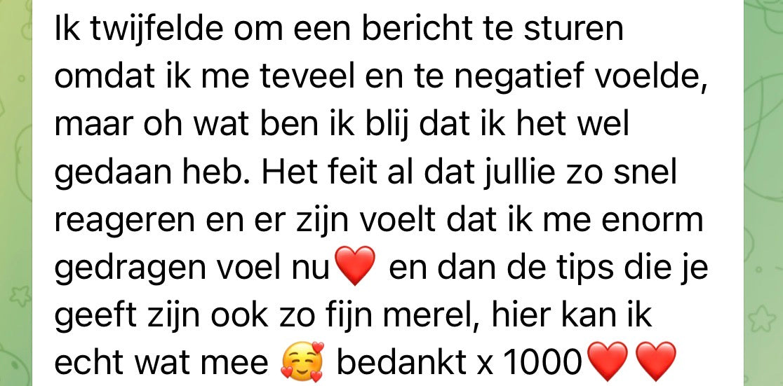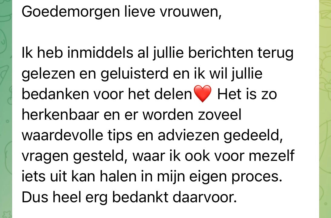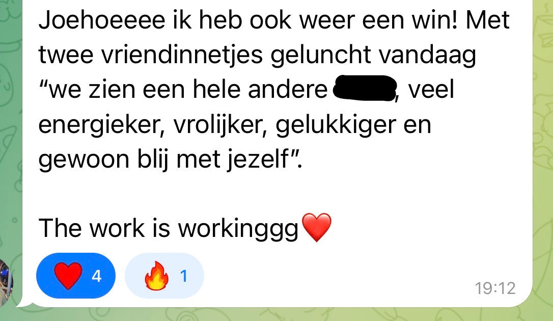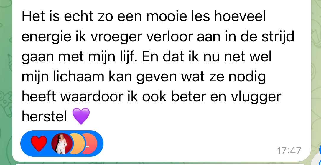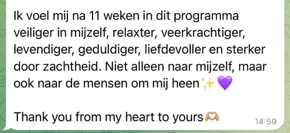 💜 Exclusieve Telegram groepschat met voice memo coaching voor support every step of the way (hier gebeurt de implementatie en dat is KEY) + om te connecten met de rest van de groep en je vragen te stellen tussendoor.