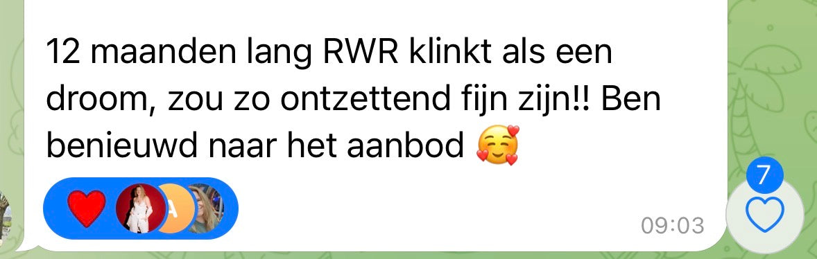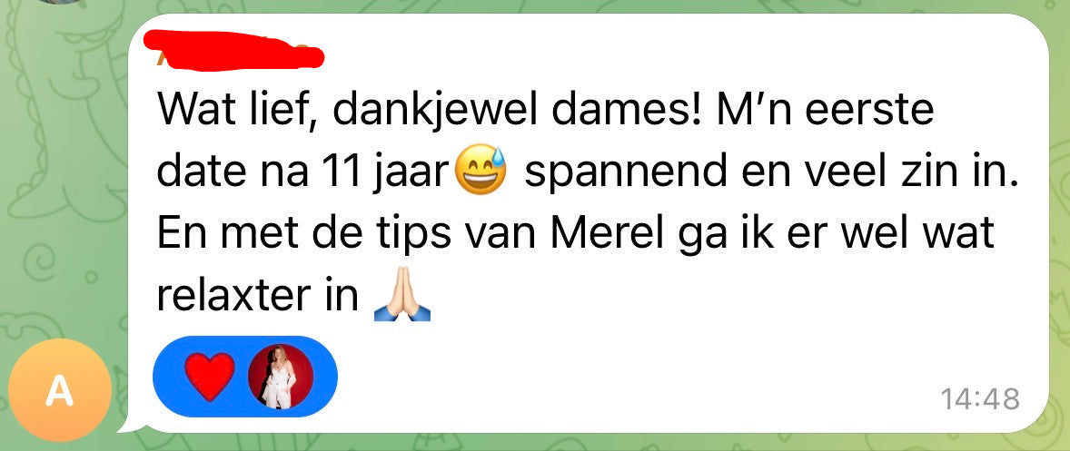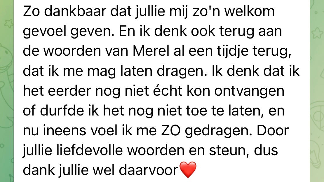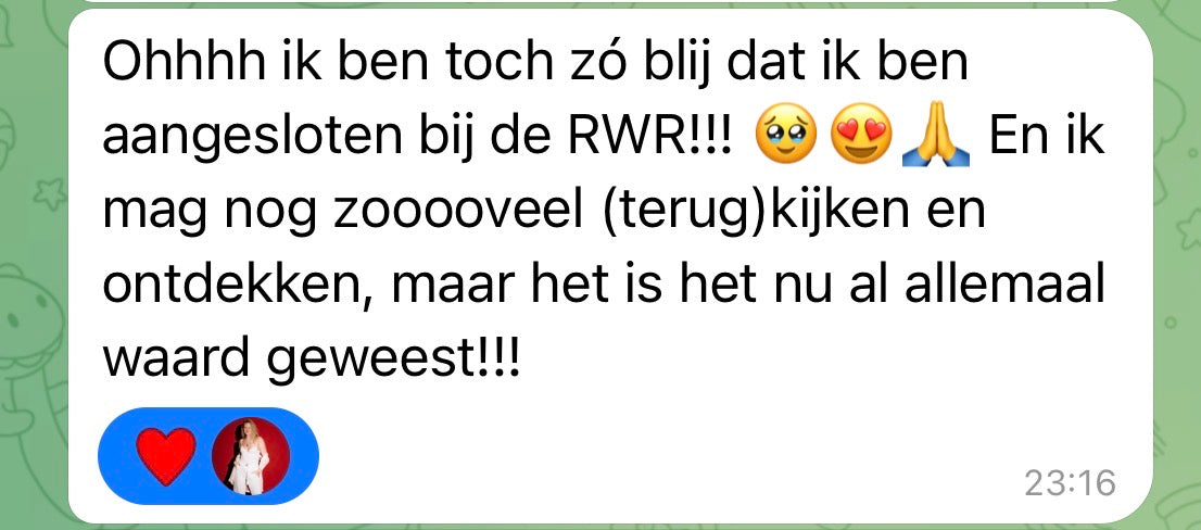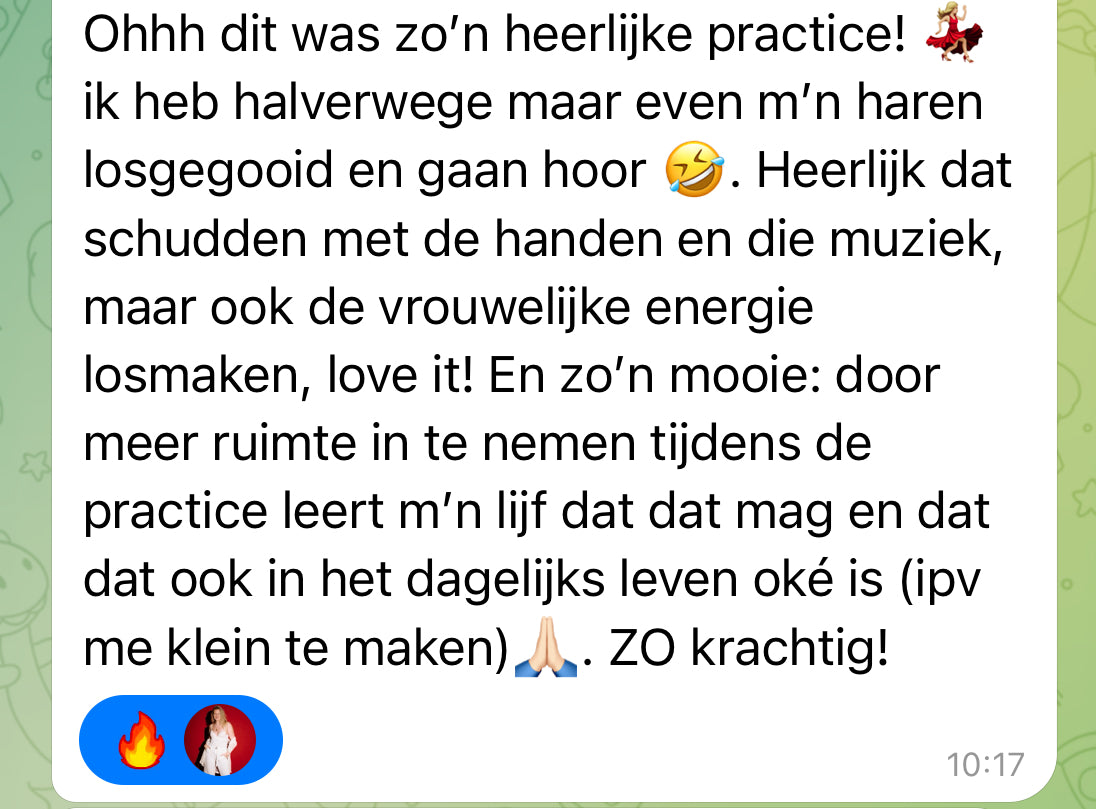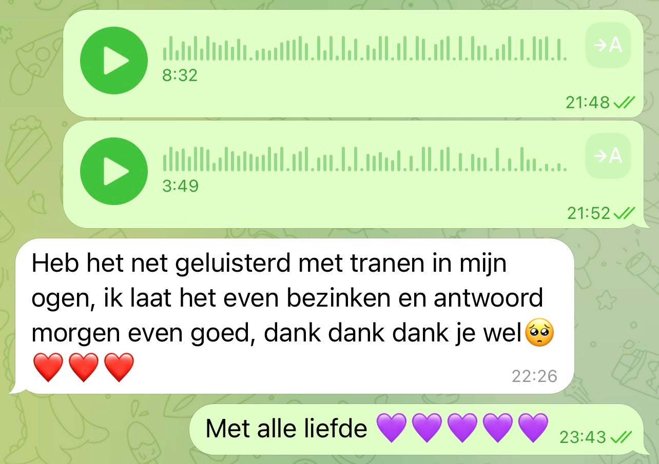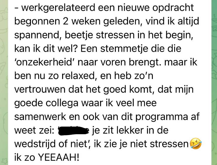 💜 Exclusieve Telegram groepschat met voice memo coaching voor support every step of the way (hier gebeurt de implementatie en dat is KEY) + om te connecten met de rest van de groep en je vragen te stellen tussendoor.