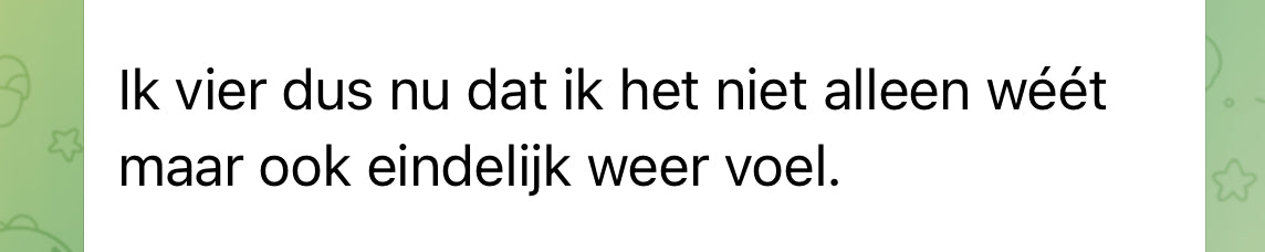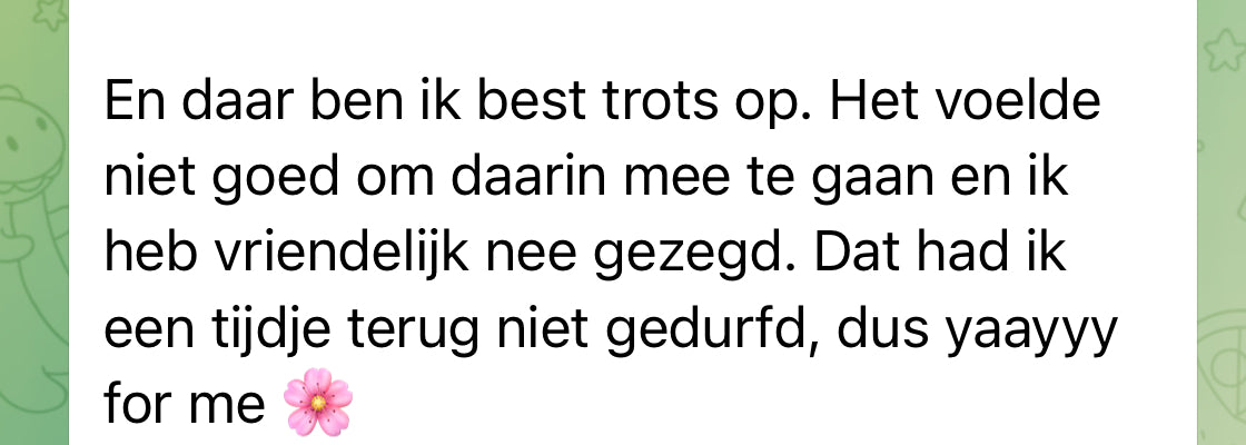 Er is geen betere investering dan de relatie met jezelf. Je lichaam. Je regulatie. Je gezondheid. Je geluk. Je flow. Want dat verandert álles. Niet even tijdelijk. Maar blijvend. Ik heb nog nooit spijt gehad van geld investeren in mezelf, ik heb alleen spijt gehad van de keren dat ik het NIET deed, omdat ik koos voor een illusie van veiligheid.